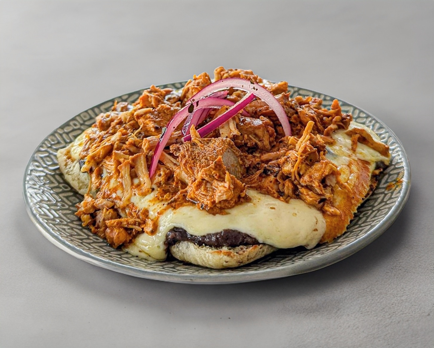 Dos tortillas a mano rellenas de delicioso queso, cochinita de la casa y cebolla curtida.