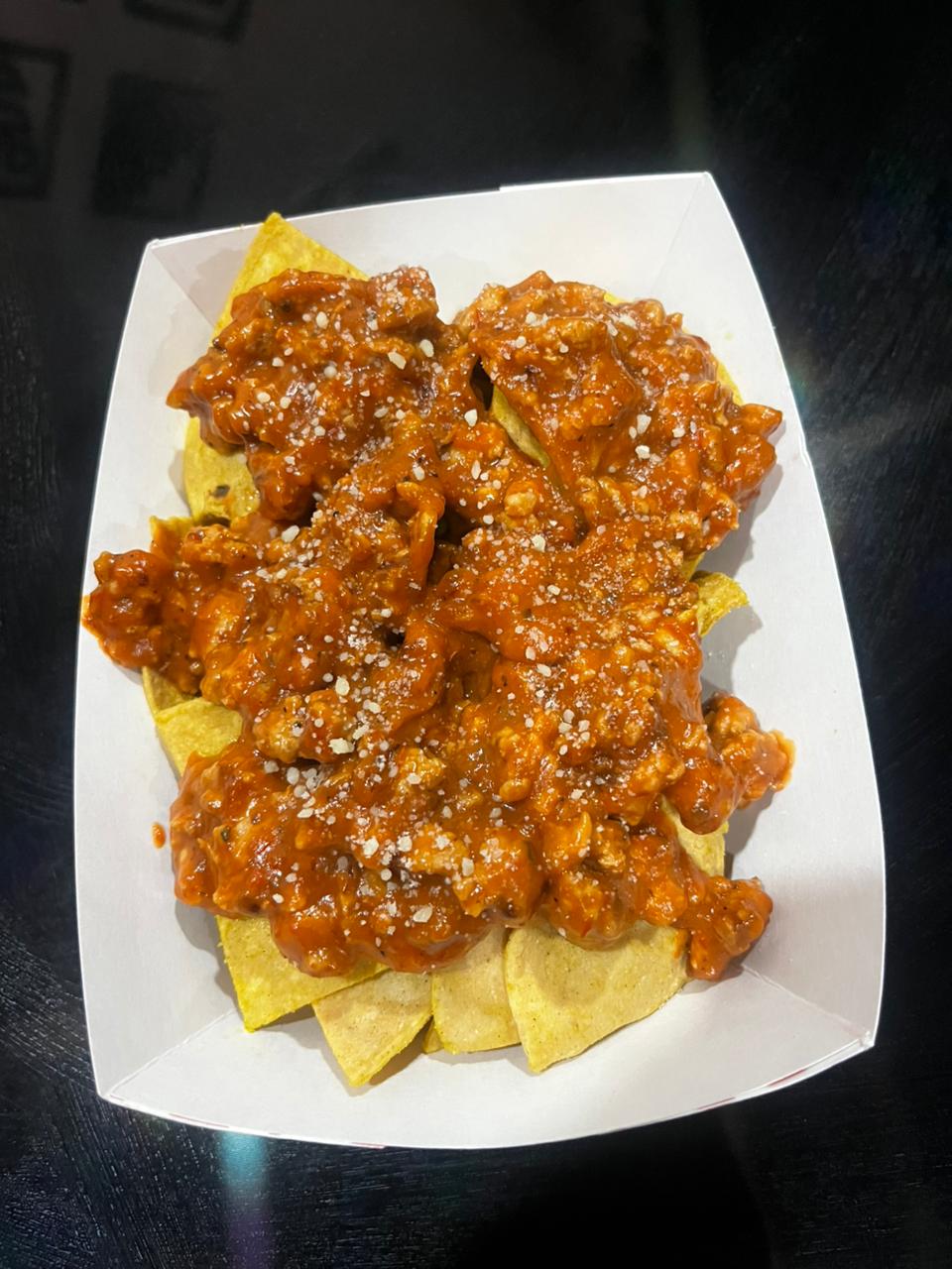 Nachos Flamin', chelados o naturales, bañados con carne a la boloñesa y quesito cheddar.