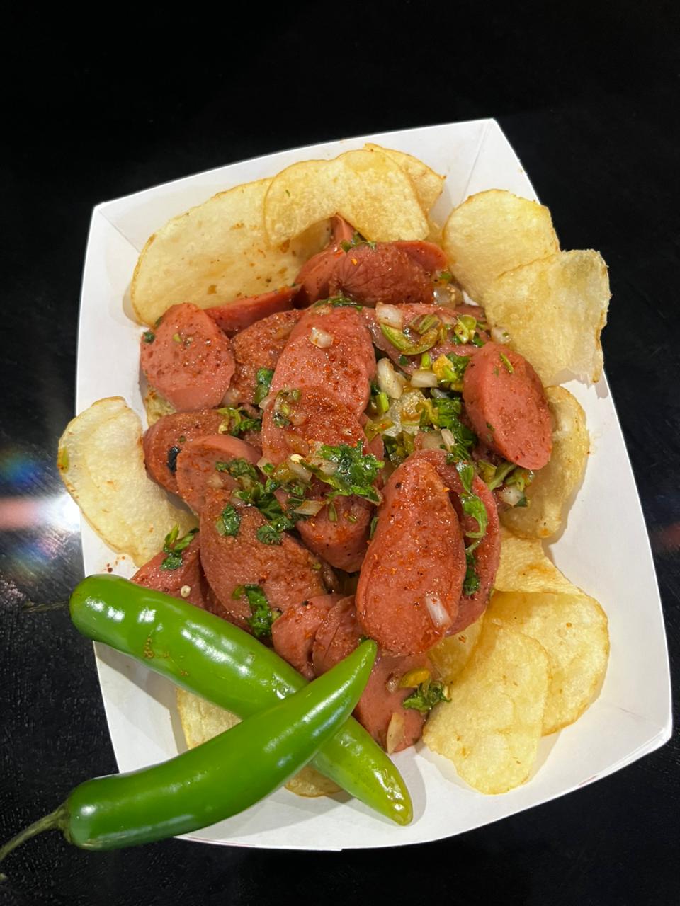 Salchichas fritas bañadas en salsa negra especial, cebollita, cilantro y chile serrano. Acompañadas con papas fritas (naturales, jalapeño o Flamin').