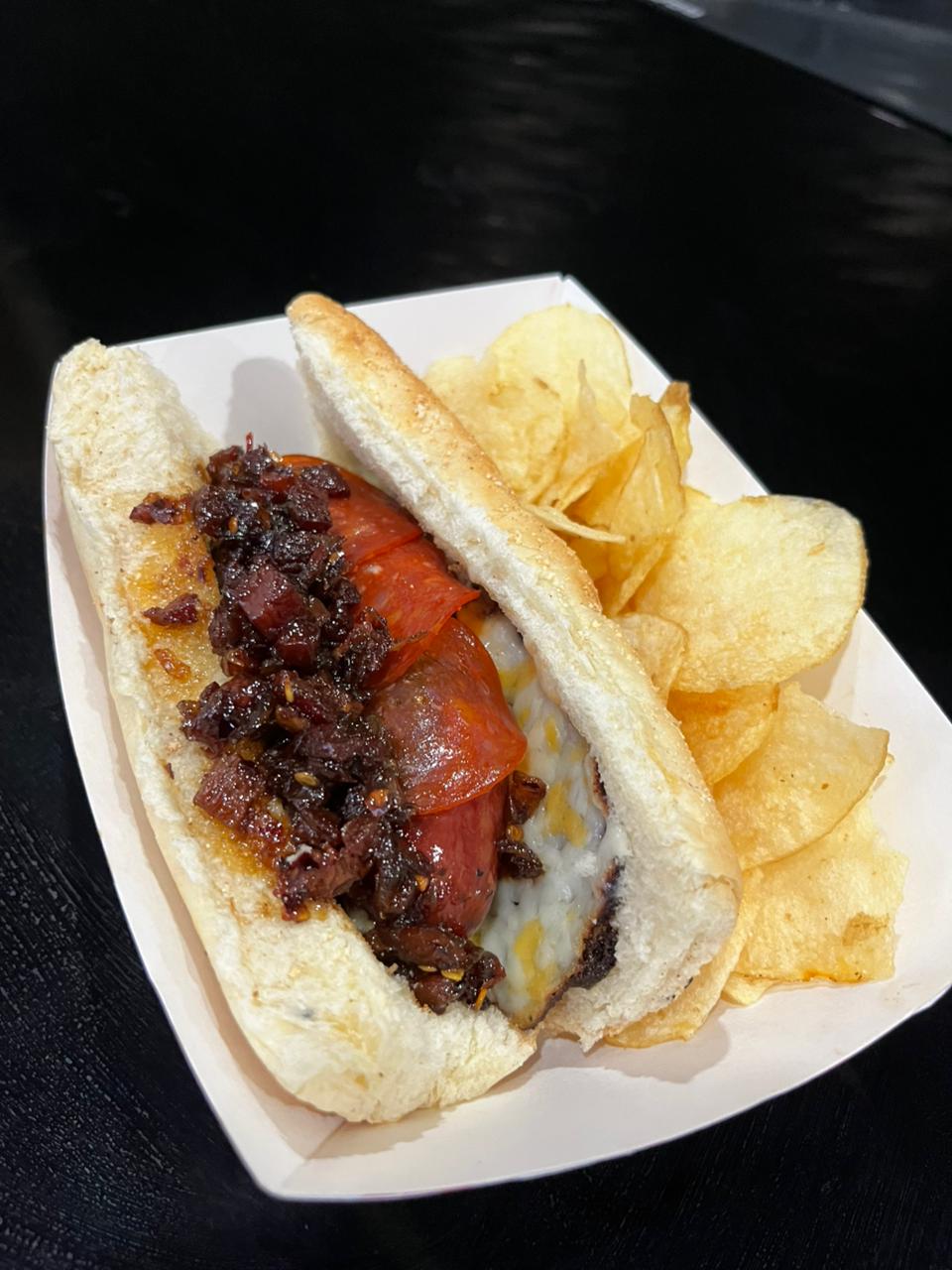 Pan artesanal con salchicha de res jumbo, envuelta en costra de queso y pepperoni, coronado con mermelada de tocino y cebollas crujientes.