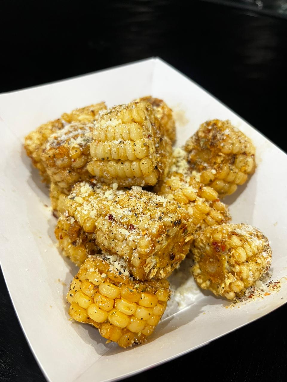 Elotes fritos bañados en mantequilla, espolvoreados con condimentos y queso parmesano.