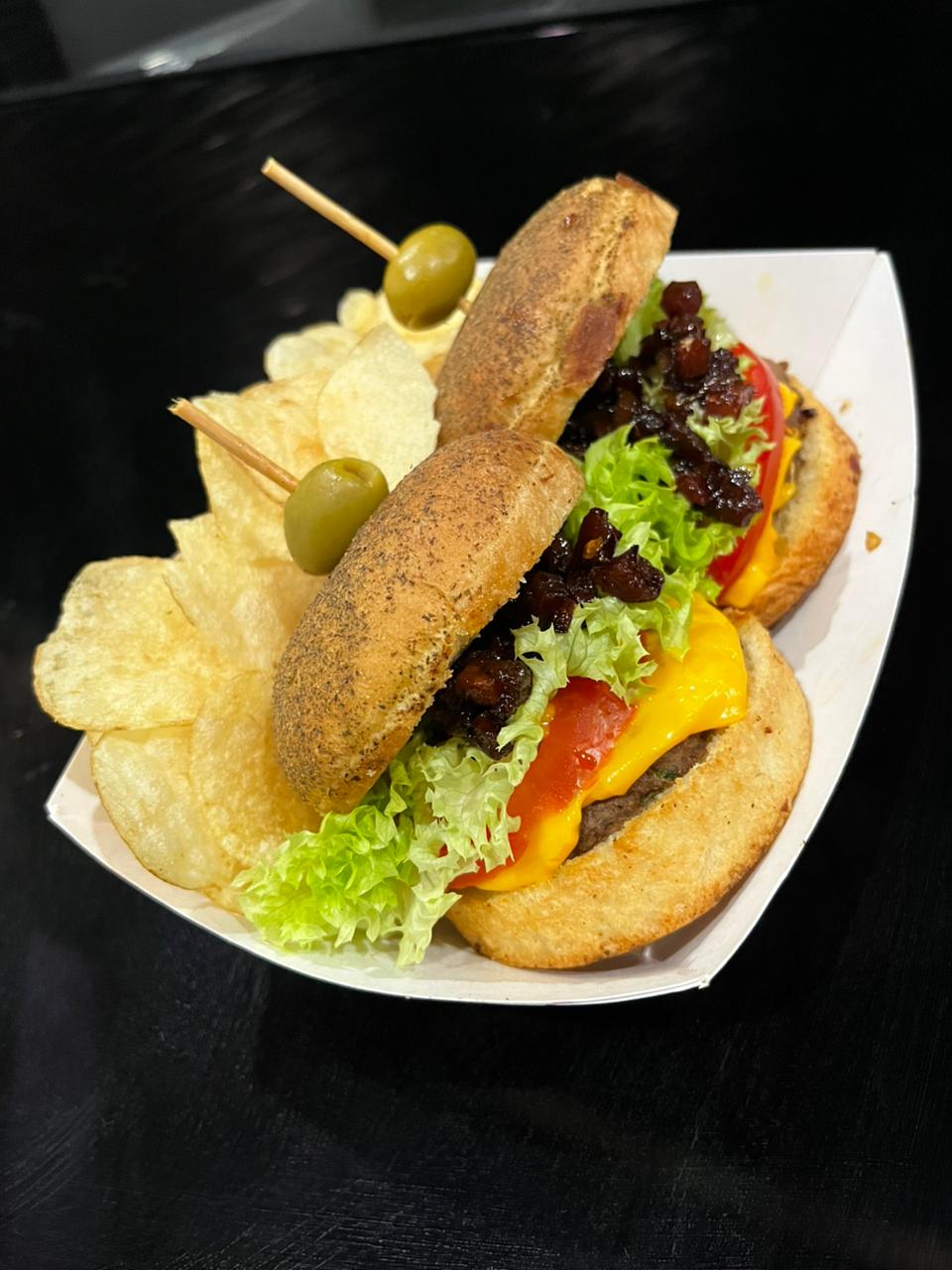 2 Hamburguesitas con carne de sirloin y mix de quesos, lechuga, jitomate, mermelada de tocino. Incluye papitas fritas (naturales, jalapeño o Flamin').