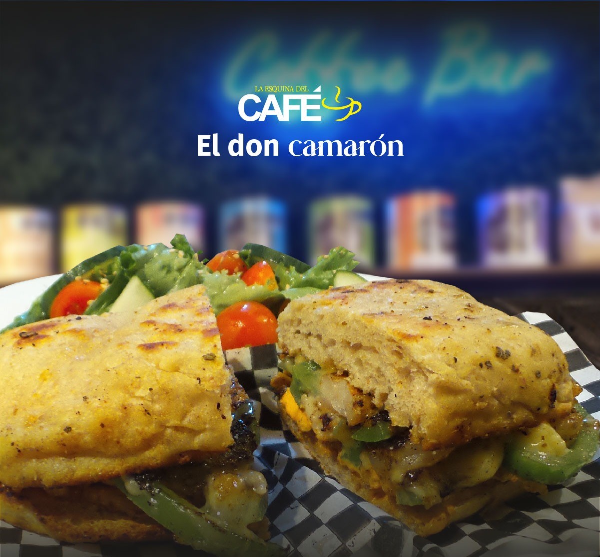 Baguette con camarón, champiñones, morrones gratinados con cebollita crujiente, aderezo de chipotle y fresca ensalada. (350gr).