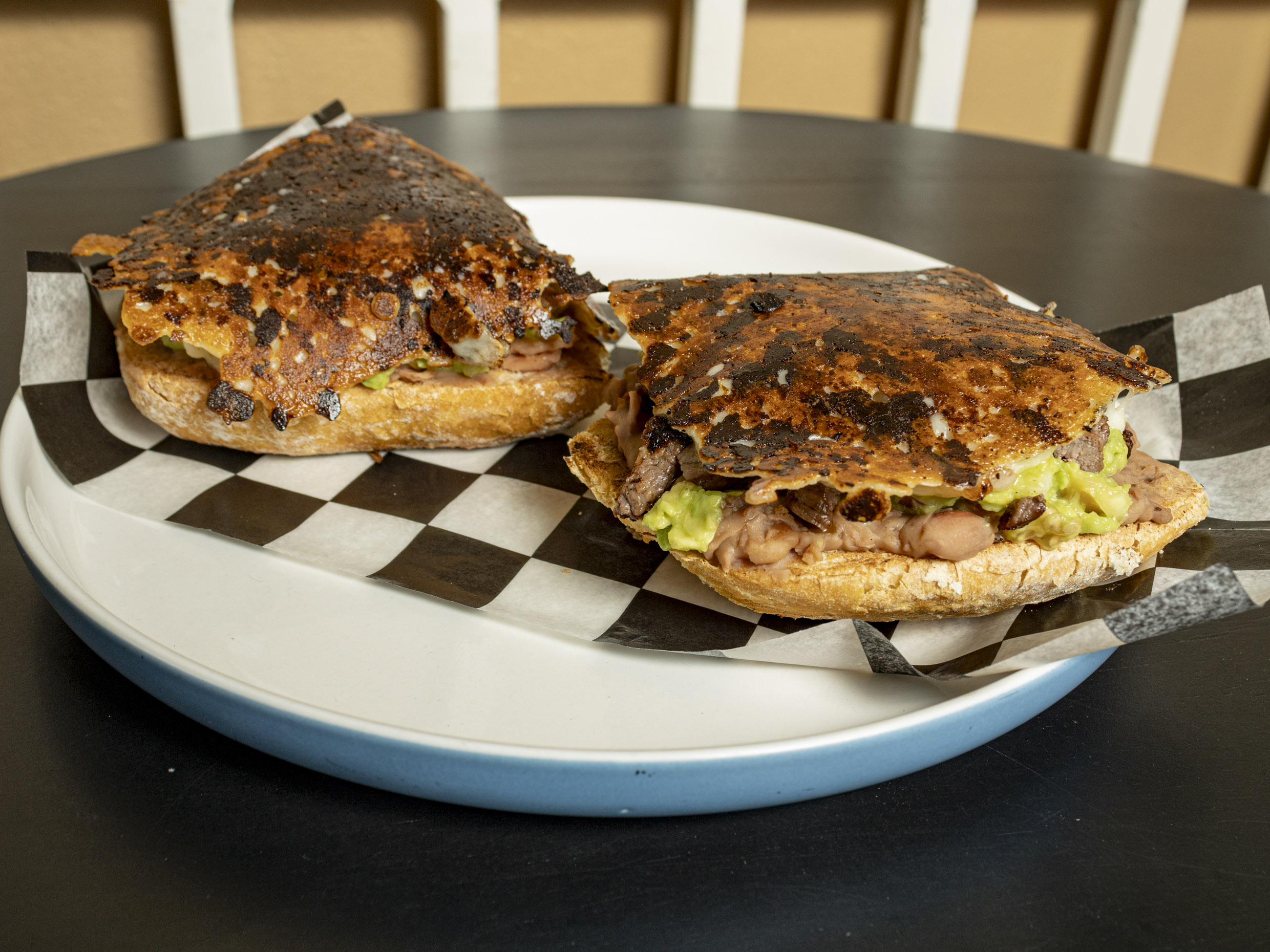 2 pzas de Bolillos untados en frijoles, gratinados con arrachera y penca de nopal asado, salsa mexicana, cremoso de aguacate y acompañados de martajada picosita.