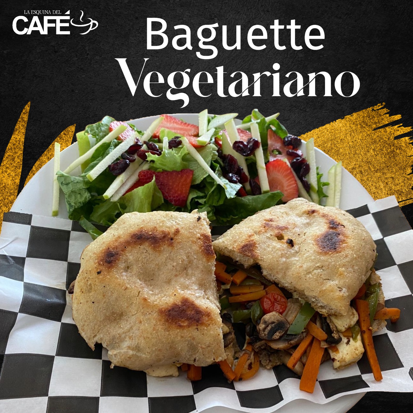 Pan tipo baguette con morrones salteados, zanahoria, calabaza, tomates cherry, hongos salteados, panela y fresca ensalada dulce. (320gr).