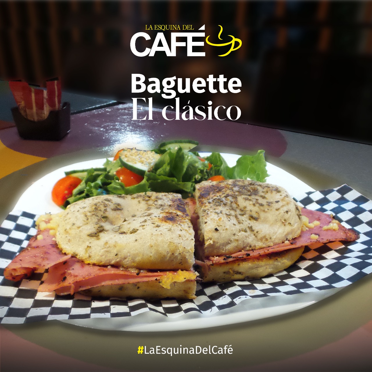 Delicioso baguette con jamón de pavo, gratinado con mozzarella, acompañado de ensalada de la casa. (300gr).
