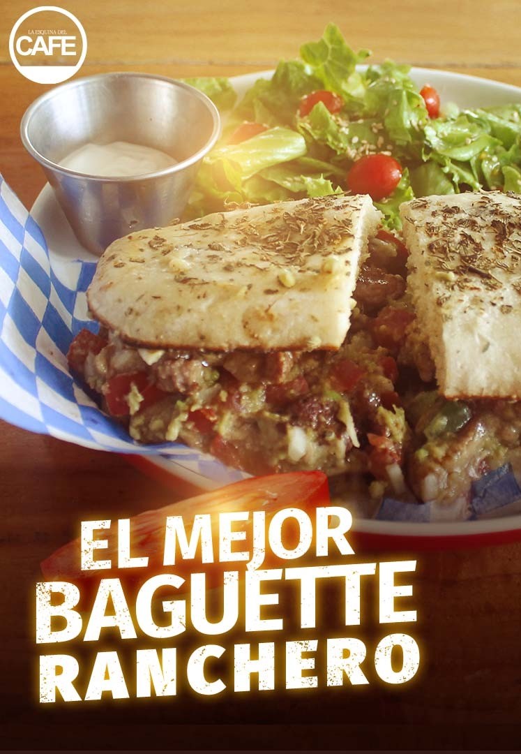 Sabroso baguette con arrachera en fajitas, champiñones, morrones gratinados con guacamole y fresca ensalada (350gr).
