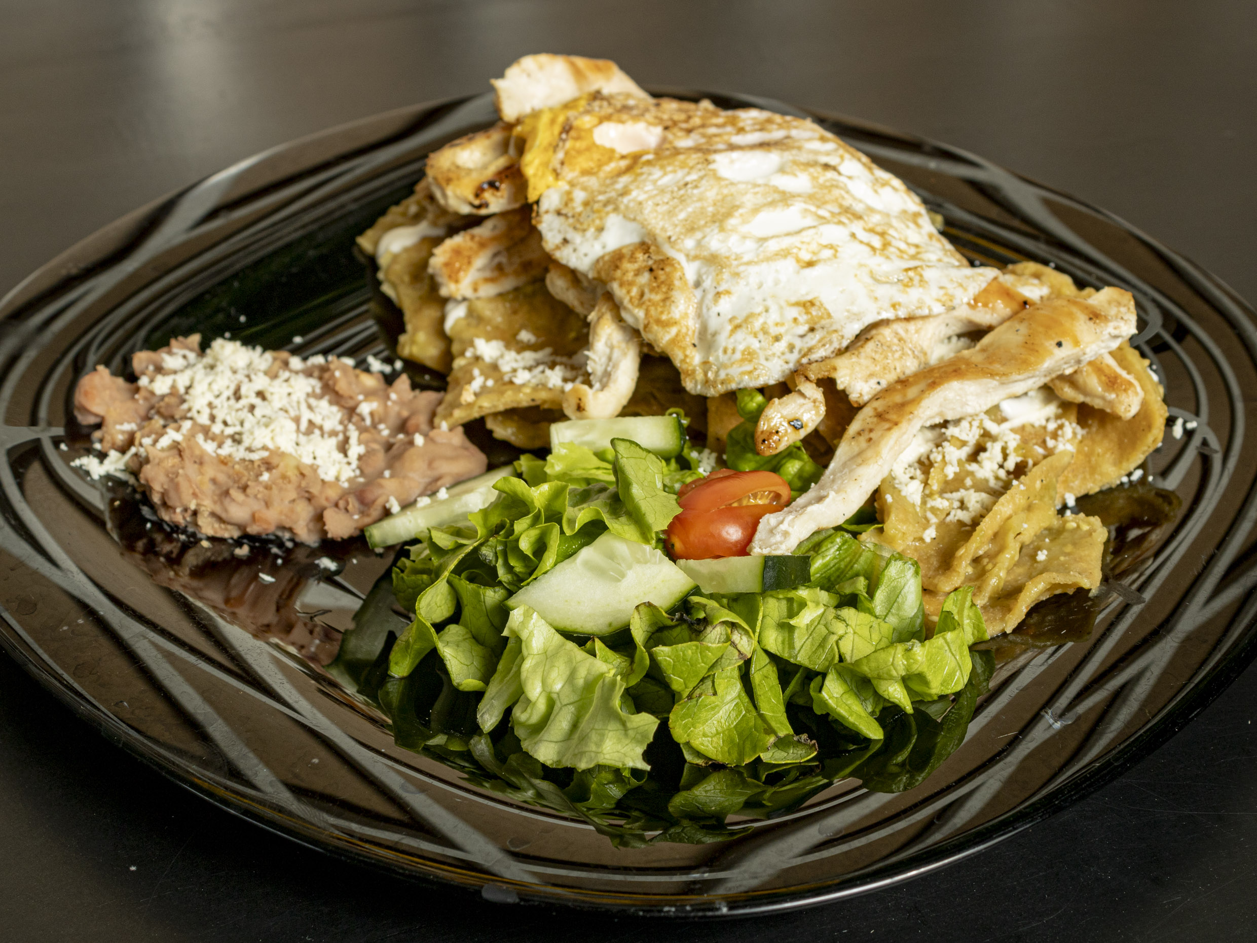 350 gr de Chilaquiles crujientes en salsa verde, acompañados de frijoles refritos y ensalada de casa.