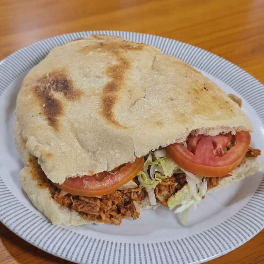 Pierna de cerdo marinada en adobo de especias, jugosa y llena de sabor, servida en pan suave recién preparado.