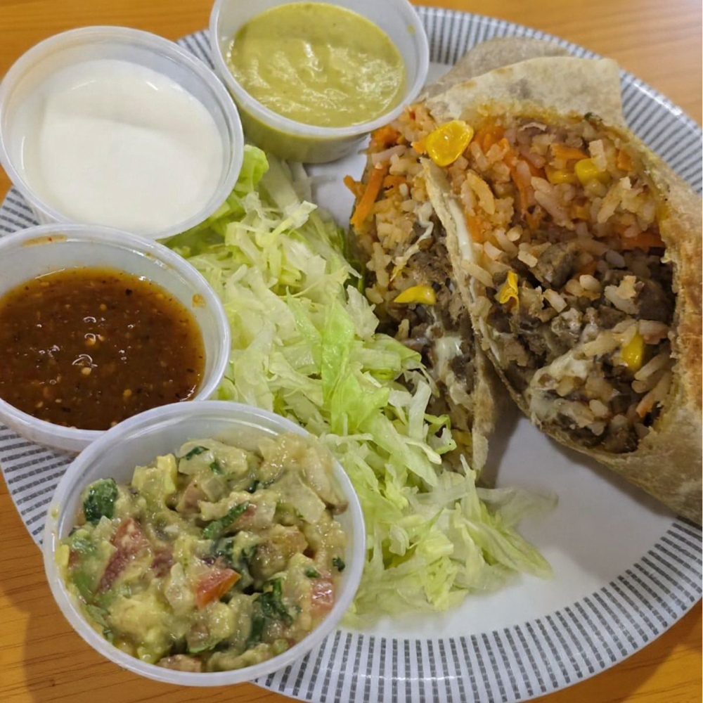 Acompañado de lechuga fresca, guacamole cremoso, pico de gallo, rellena de arroz y frijoles con salsa roja casera.