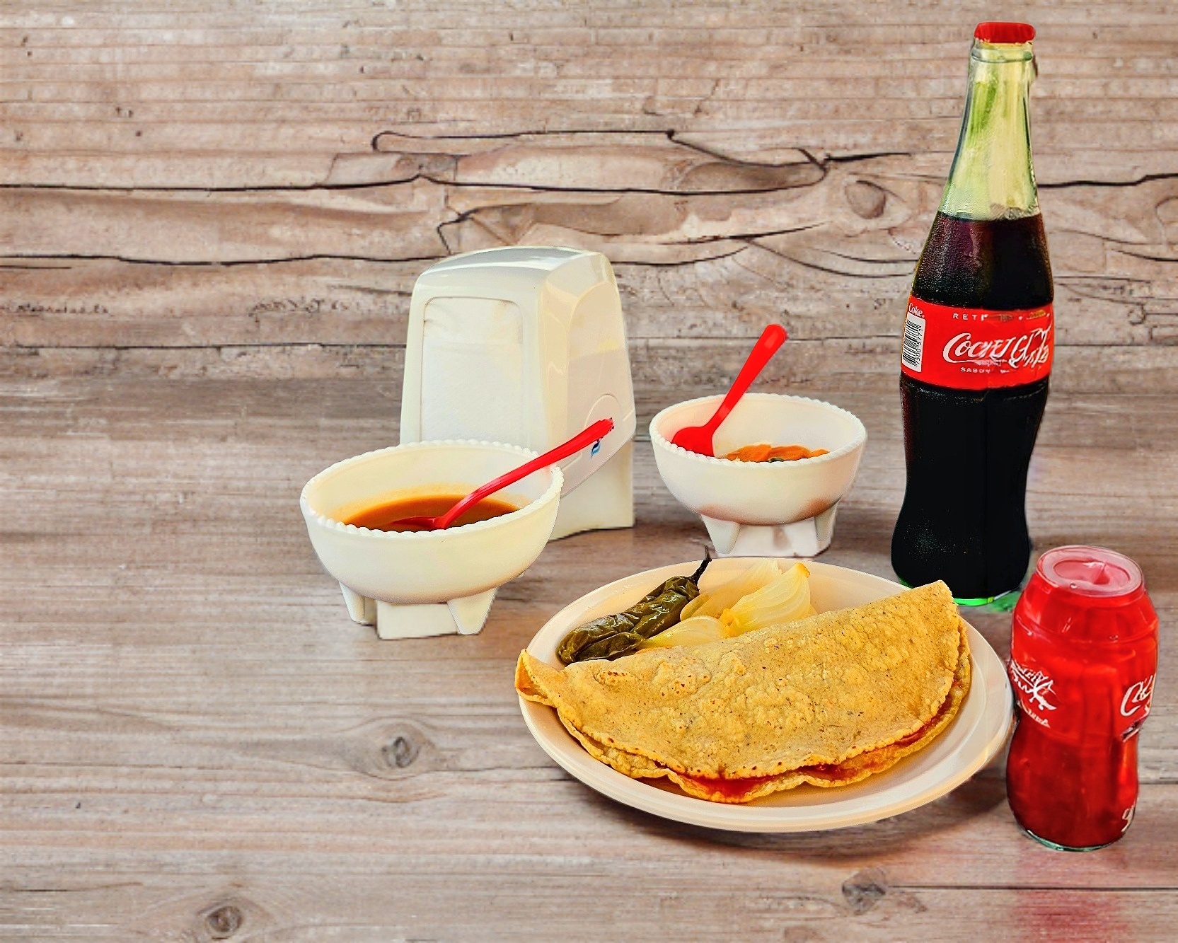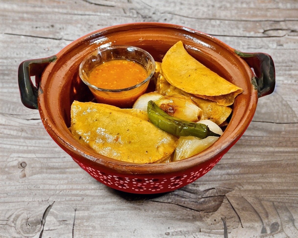 Quesadilla Grande de Maíz (Aproximadamente 20 cm.), Acompañada de Cebolla Guisada, Chile Toreado, Salsa y Fruta en Vinagre.