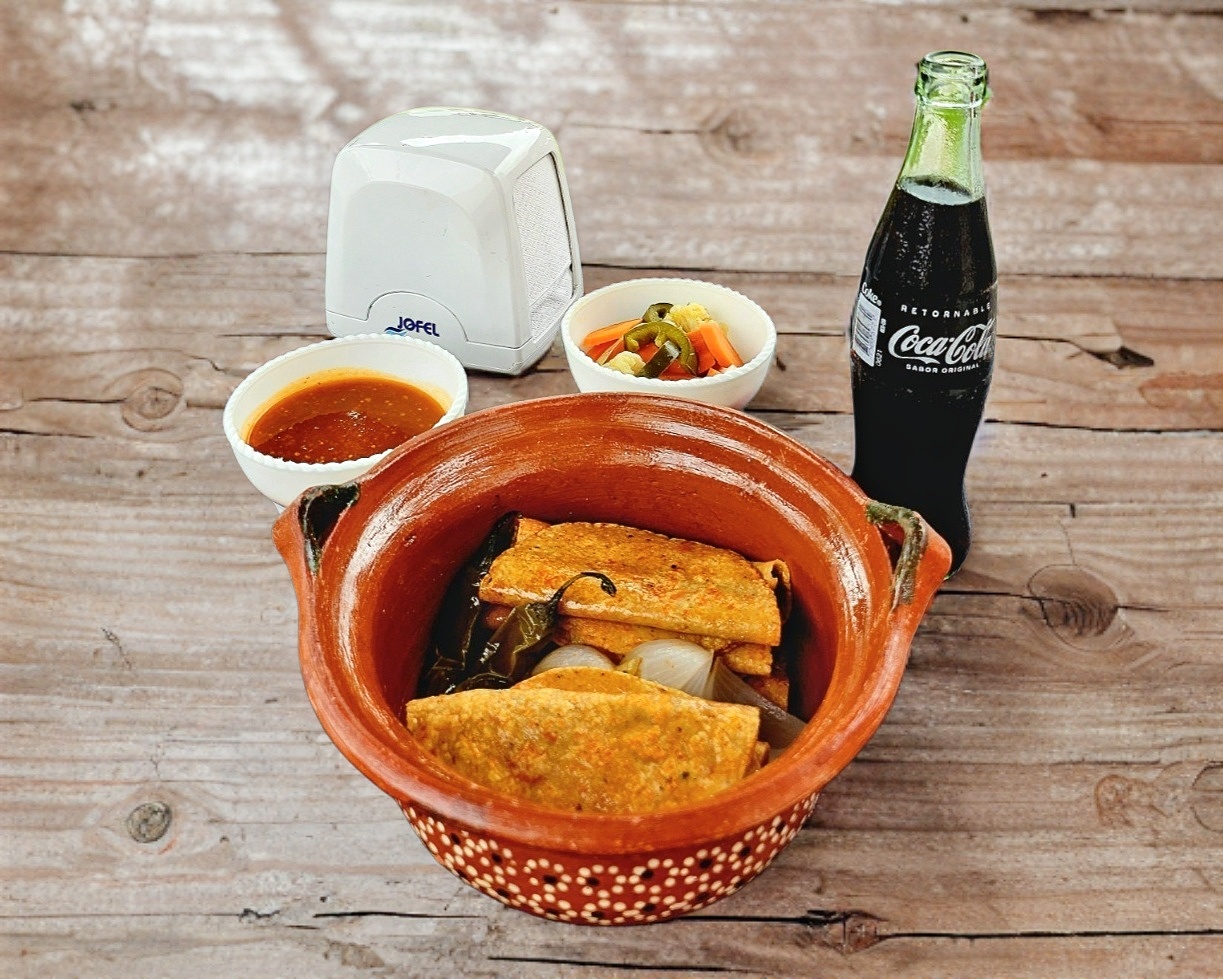 Taco de Carne Hecho Con Tortilla de Maíz a Mano, Acompañado de Cebolla Guisada, Chile Toreado, Salsa y Fruta en Vinagre.