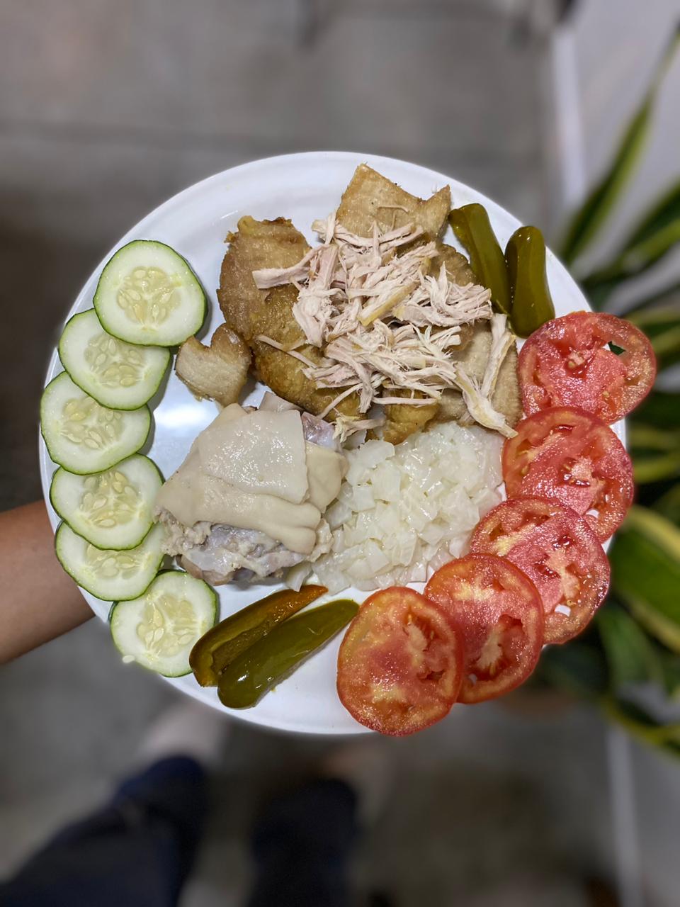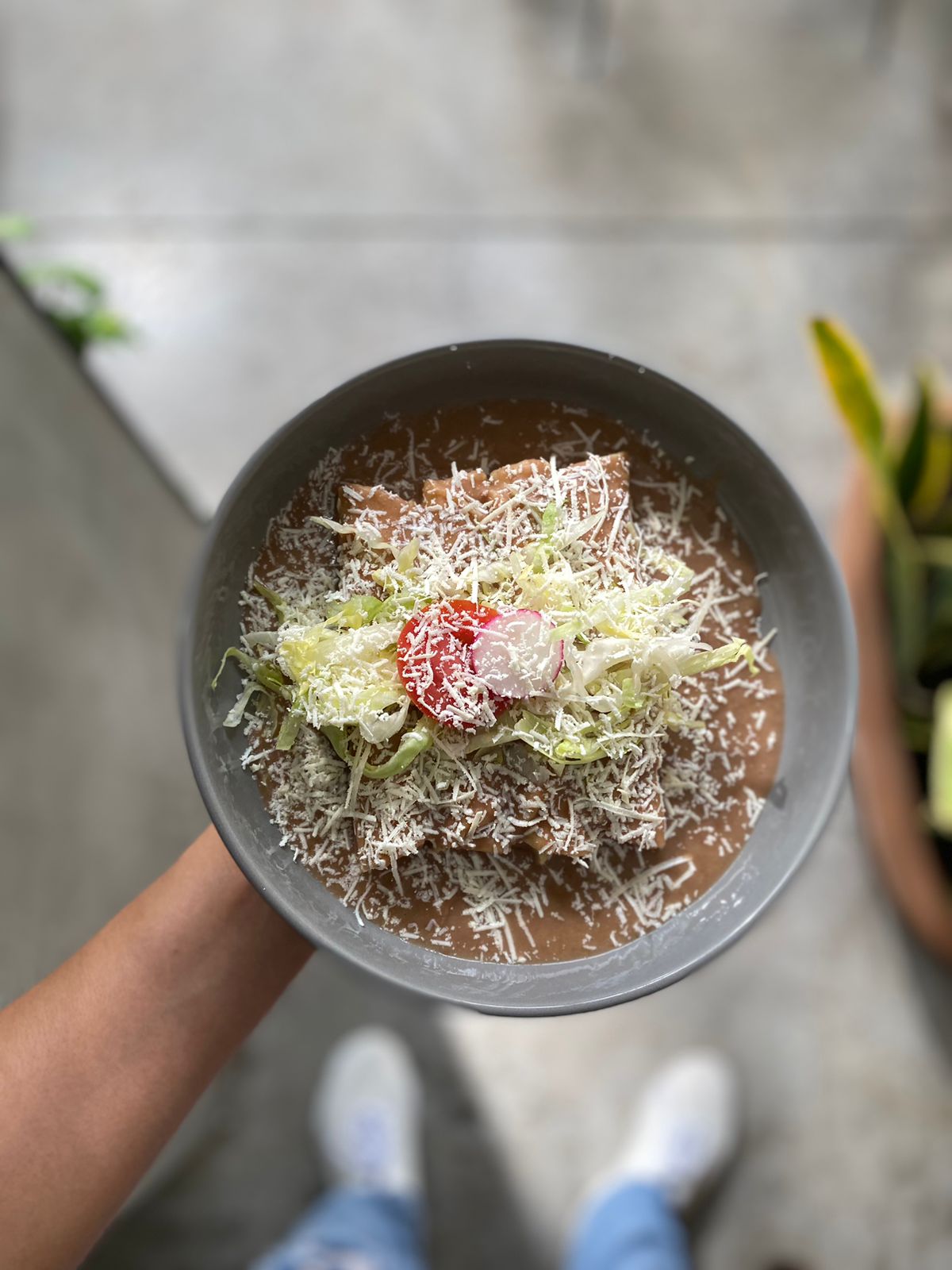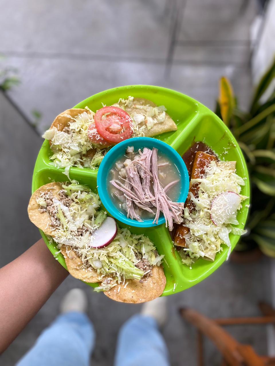 4 Sopitos, 1 enchilada verde, 1 enchilada dulce, 1 taco dorado, pozole con caldo o seco.