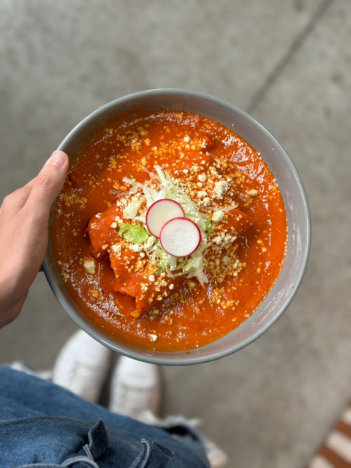 Flautas bañadas en salsa verde o roja, acompañadas de crema y queso seco.
