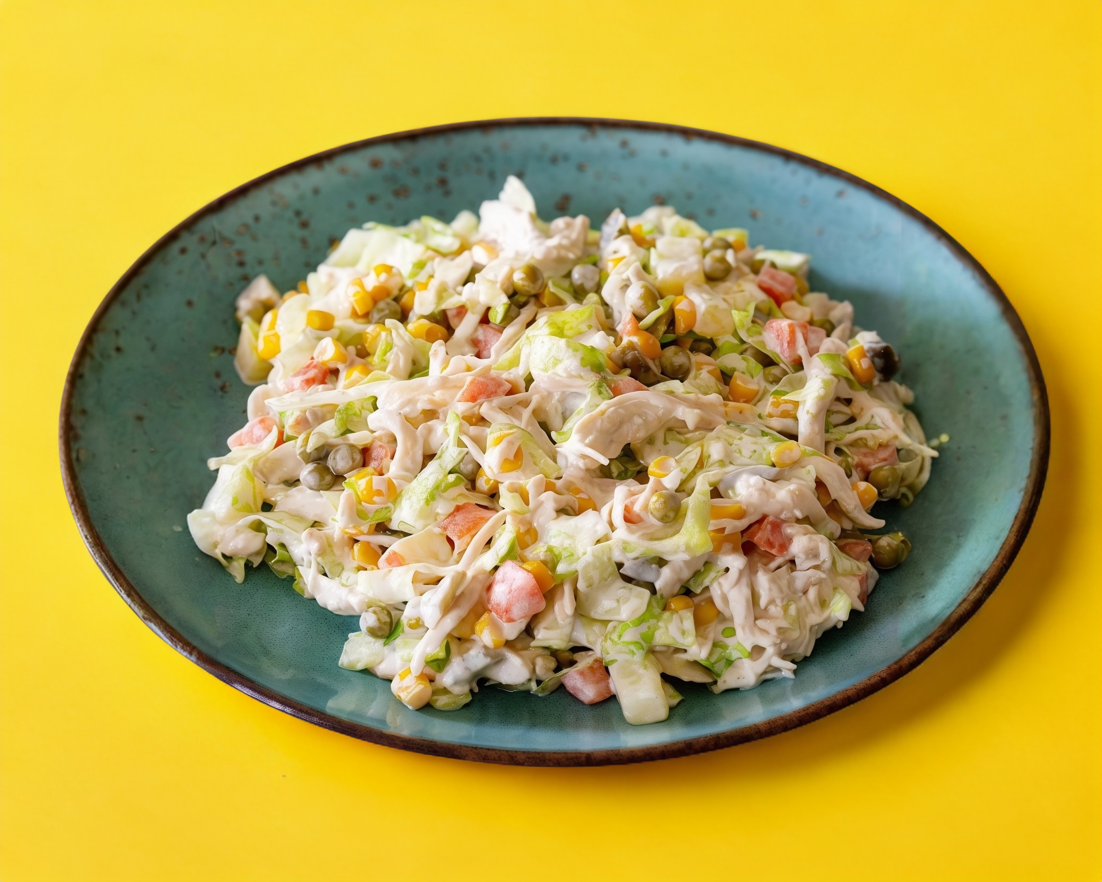 Ensalada campesina, mayonesa y pechuga deshebrada en una acama de lechuga y totopos.