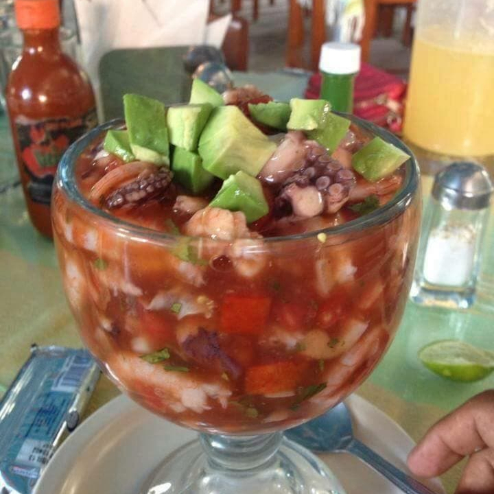 Cóctel de camarón y pulpo Con jitomate, cebolla, aguacate, totopos y galletas. El cóctel se envía caliente por defecto; indica en tu pedido si prefieres que llegue frío