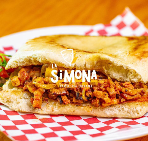 Telera dorada con 2 carnes, queso manchego gratinado, cilantro, cebolla y limón.