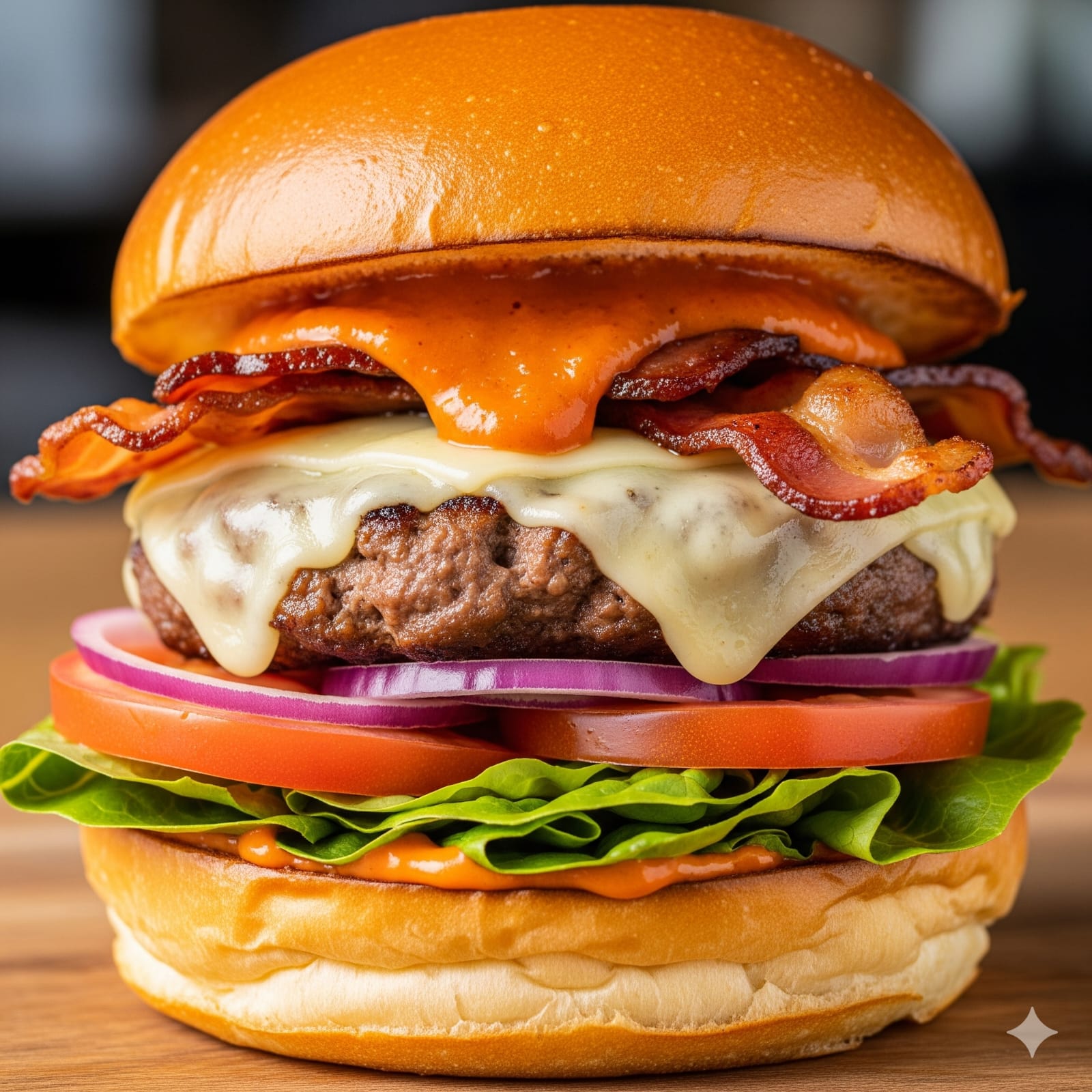 Doble carne de res 100% (120 gr c/u) con la receta casera, pan grande, queso amarillo, crujientes tiras de tocino , BBQ, lechuga, jitomatey cebolla…