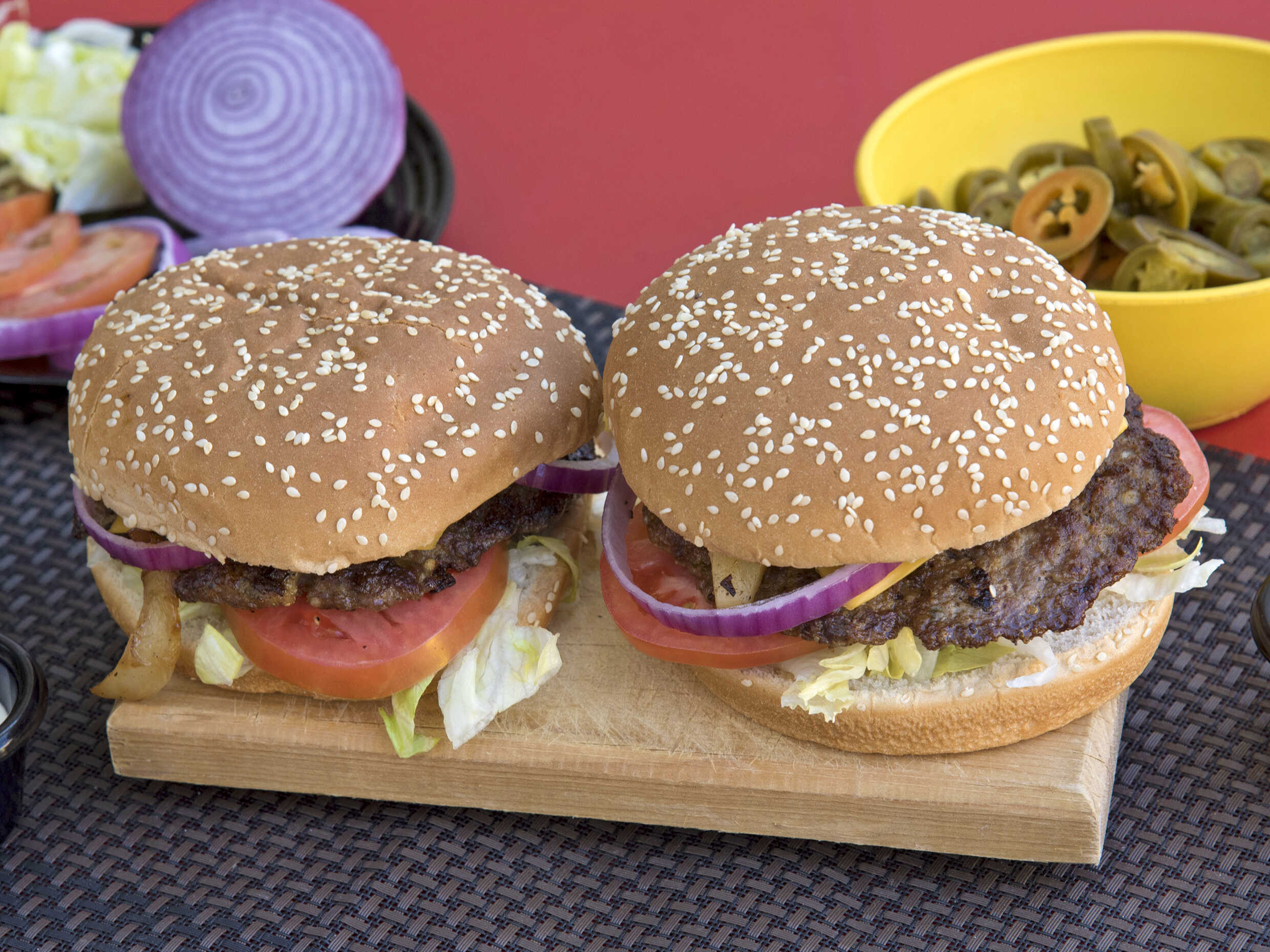Carne 100% de res (120 gr) a la plancha con queso amarillo, tiras de crujiente tocino, lechuga, jitomate y cebolla.
