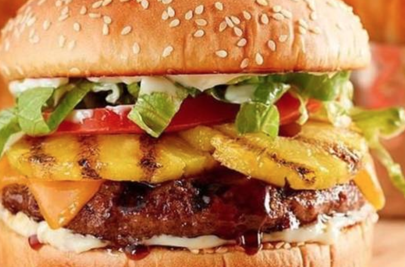 Lleva dos hamburguesas de Carne 100% de res (120 gr) a la plancha con queso amarillo, con trozos de piña, lechuga, jitomate y cebolla.