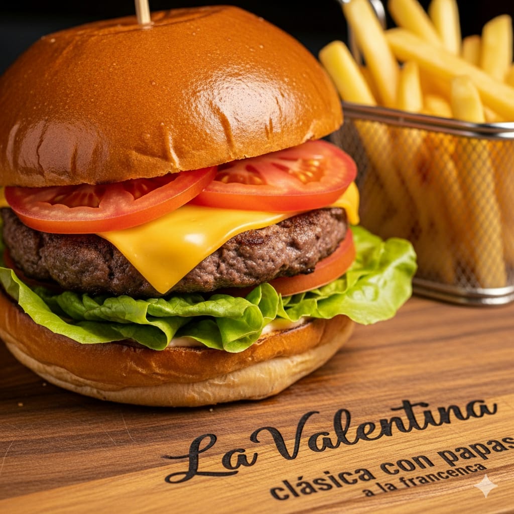 Hamburguesa de 75 gramos acompañada con papas fritas.