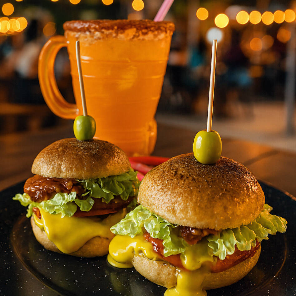 2 ricas hamburguecitas con carne de sirloin y mix de quesos, lechuga, jitomate, mermelada de tocino. Acompañadas de papas fritas.