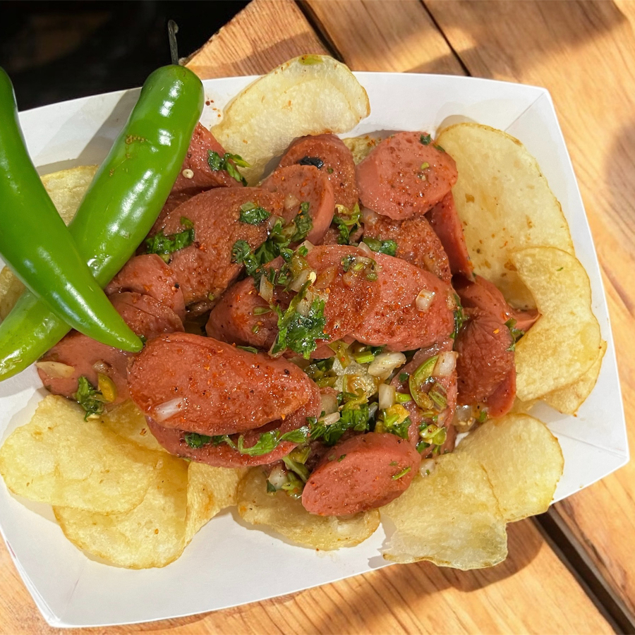 salchichas fritas bañadas en nuestra salsa negra especial, cebollita, cilantro y un toque de chile serrano, acompañadas con papas fritas (naturales, jalapeño o flamin) poner 2 opciones de papas.