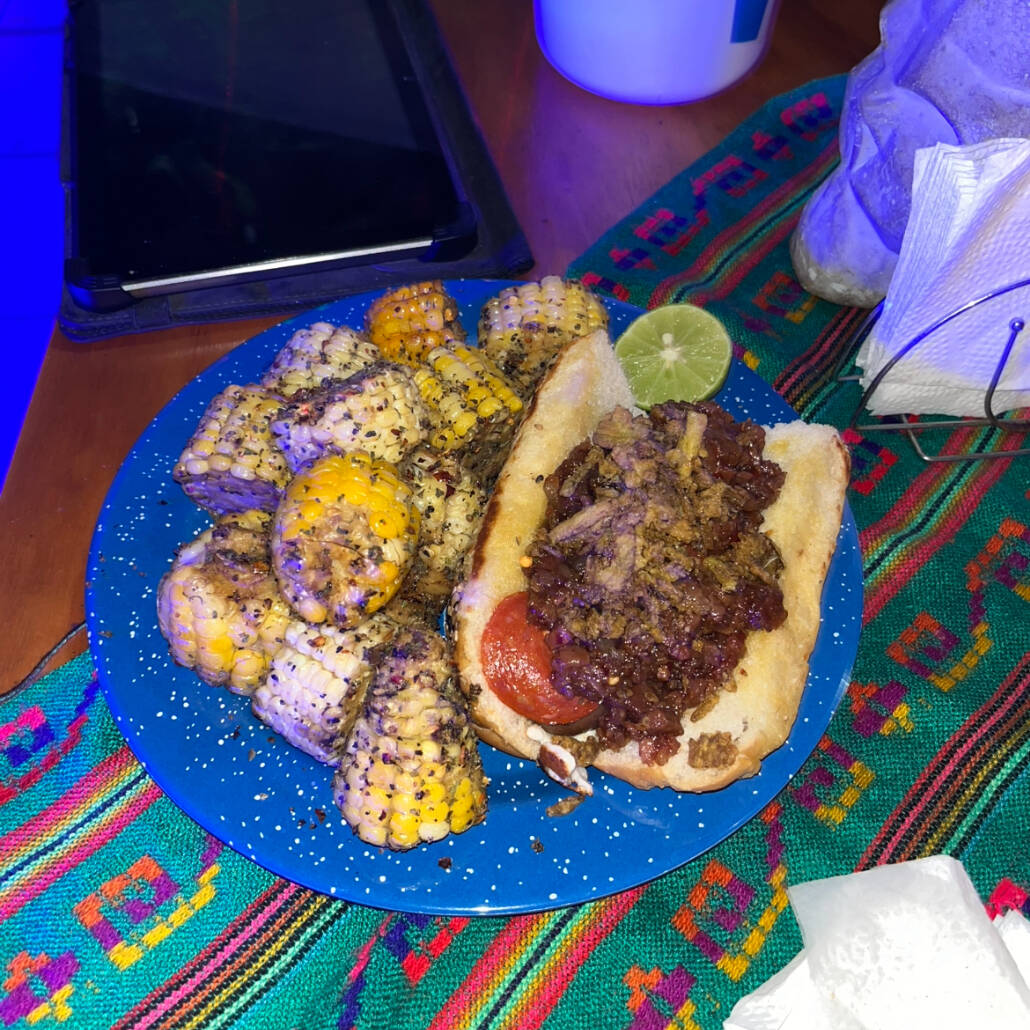 Pan artesanal con salchicha de res jumbo, envuelta en costra de queso y peperoni, coronado con mermelada de tocino y cebollitas crujientes. Acompañado de papas.