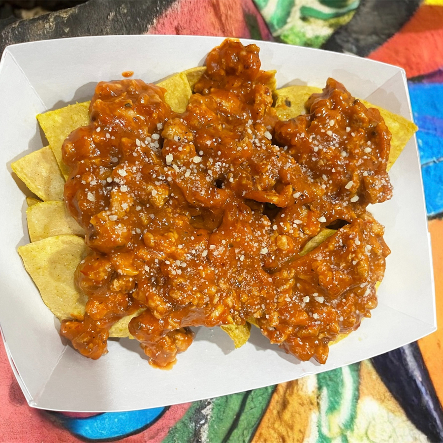 nachos (flamin, naturales o chelados poner 2 opciones) bañados con carne a la boloñesa y queso chedar