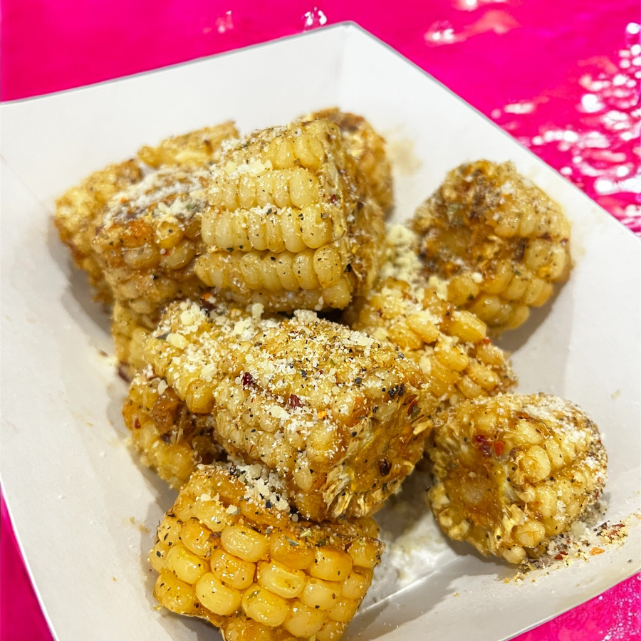 sabrosos trocitos de elote fritos, bañados en mantequilla, espolvoreados con mis de condimentos y queso parmesano.