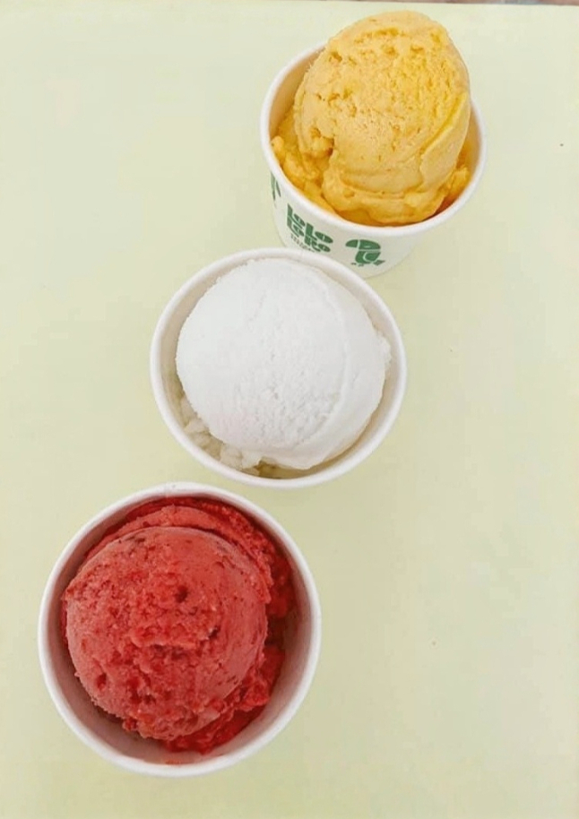 Medio litro de helado a elegir su gusto, leche (helado a base de leche, fruta o cereales según su sabor) o agua (helado a base de fruta, agua y azúcar)