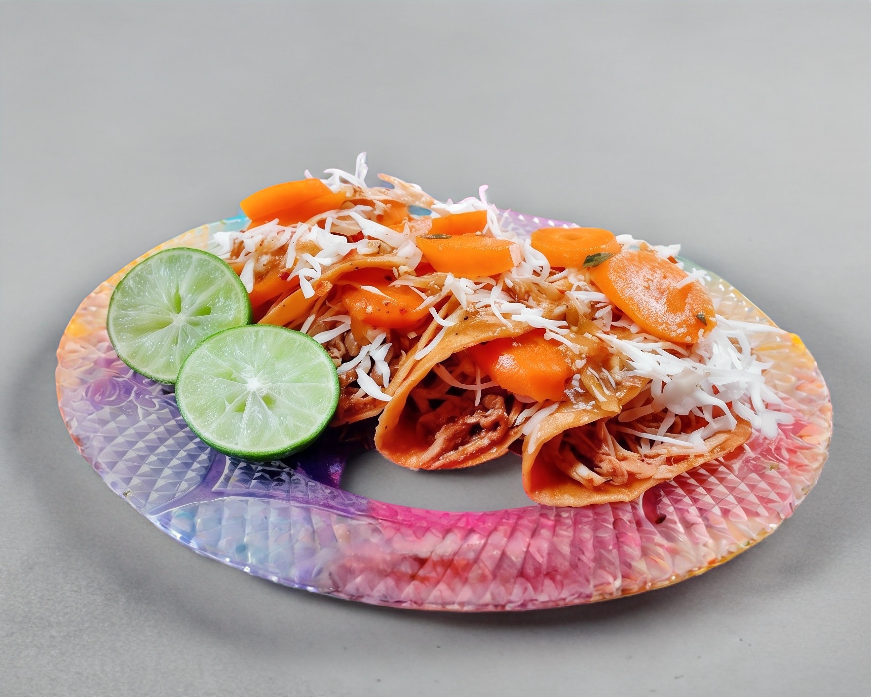 Dos tortillas de 25 g engrasadas, doradas y rellenas de carne de res con queso asadero. Acompañada de repollo, salsa y zanahorias en vinagre.