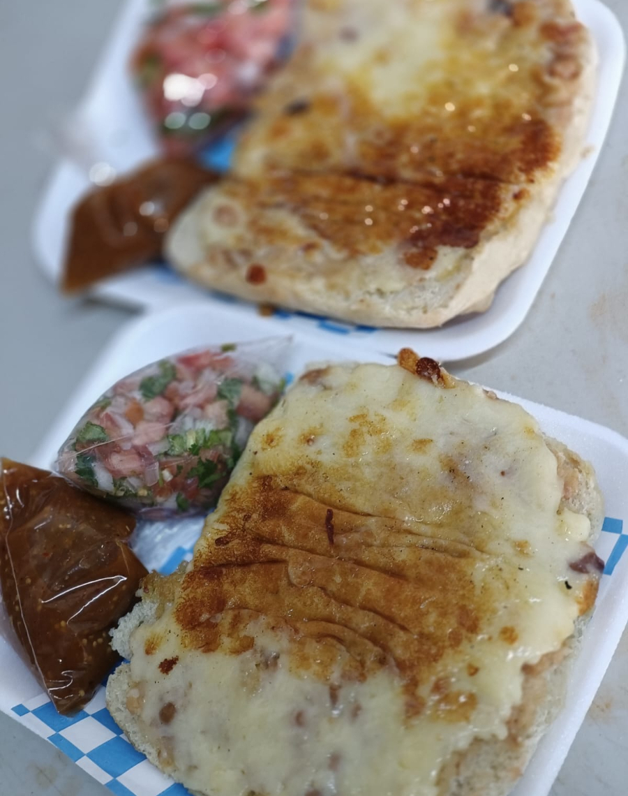 Es una mitad de telera mediana con frijoles refritos, queso asadero acompañada de jitomate, cebolla, chile verde, cilantro, limón y salsa.