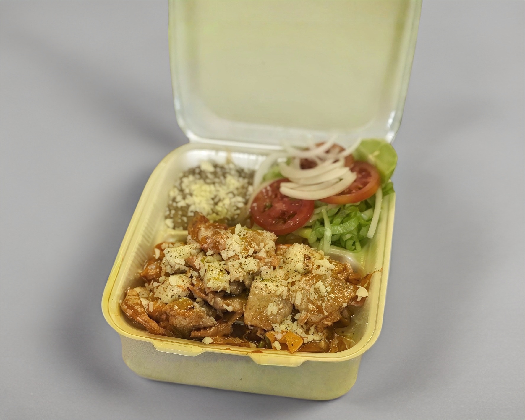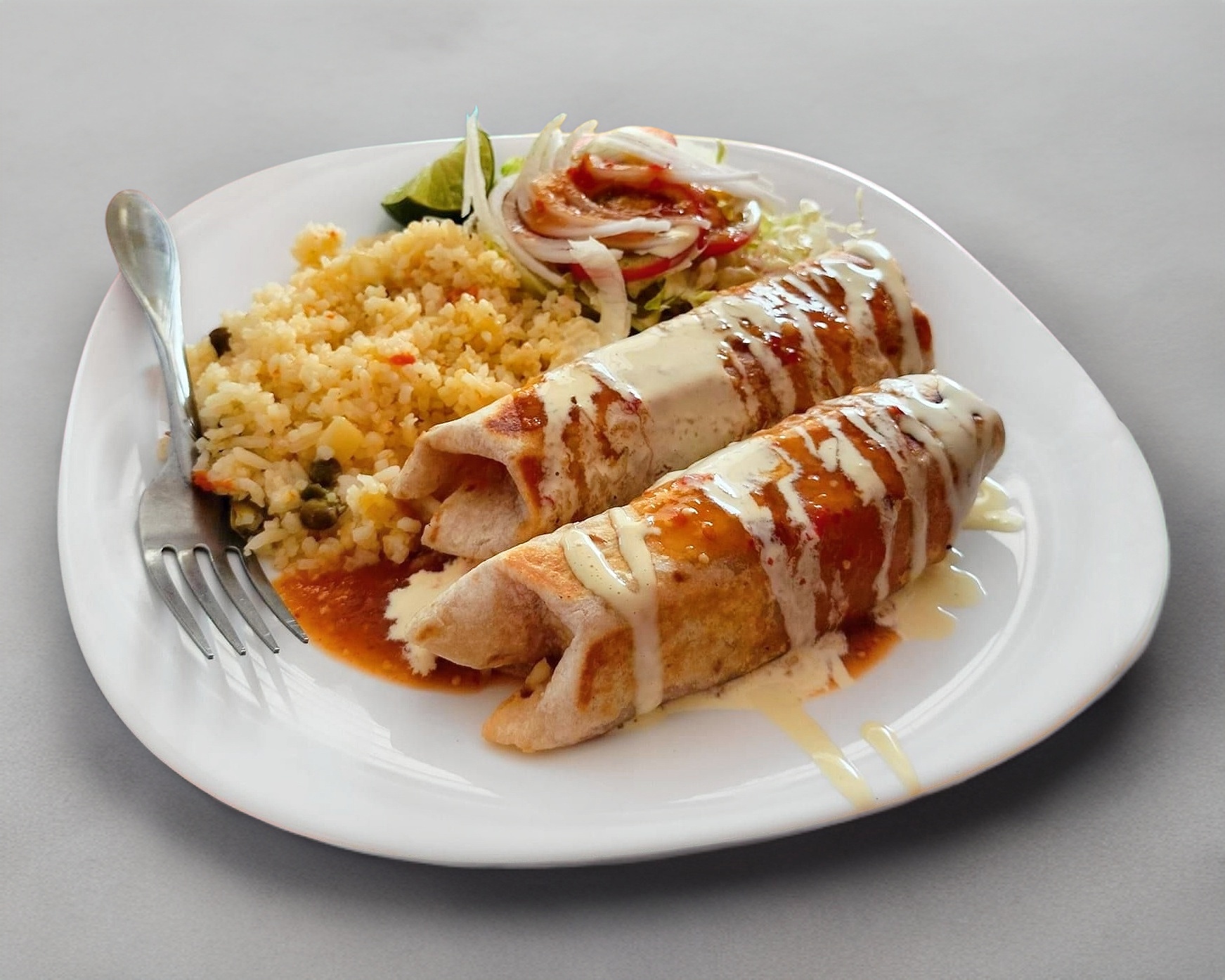 Dos tortillas de harina de tamaño grande rellenas de lomo natural, frijoles refritos y queso asadero. Acompañado con ensalada de lechuga, jitomate, cebolla y salsa.