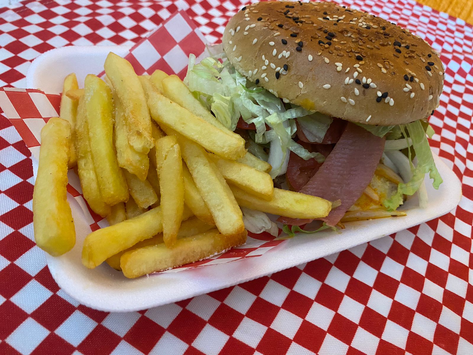 Pan parrillero Bimbo, carne casera, queso amarillo, lechuga, jitomate, cebolla, chile jalapeño y papas a la francesa.
