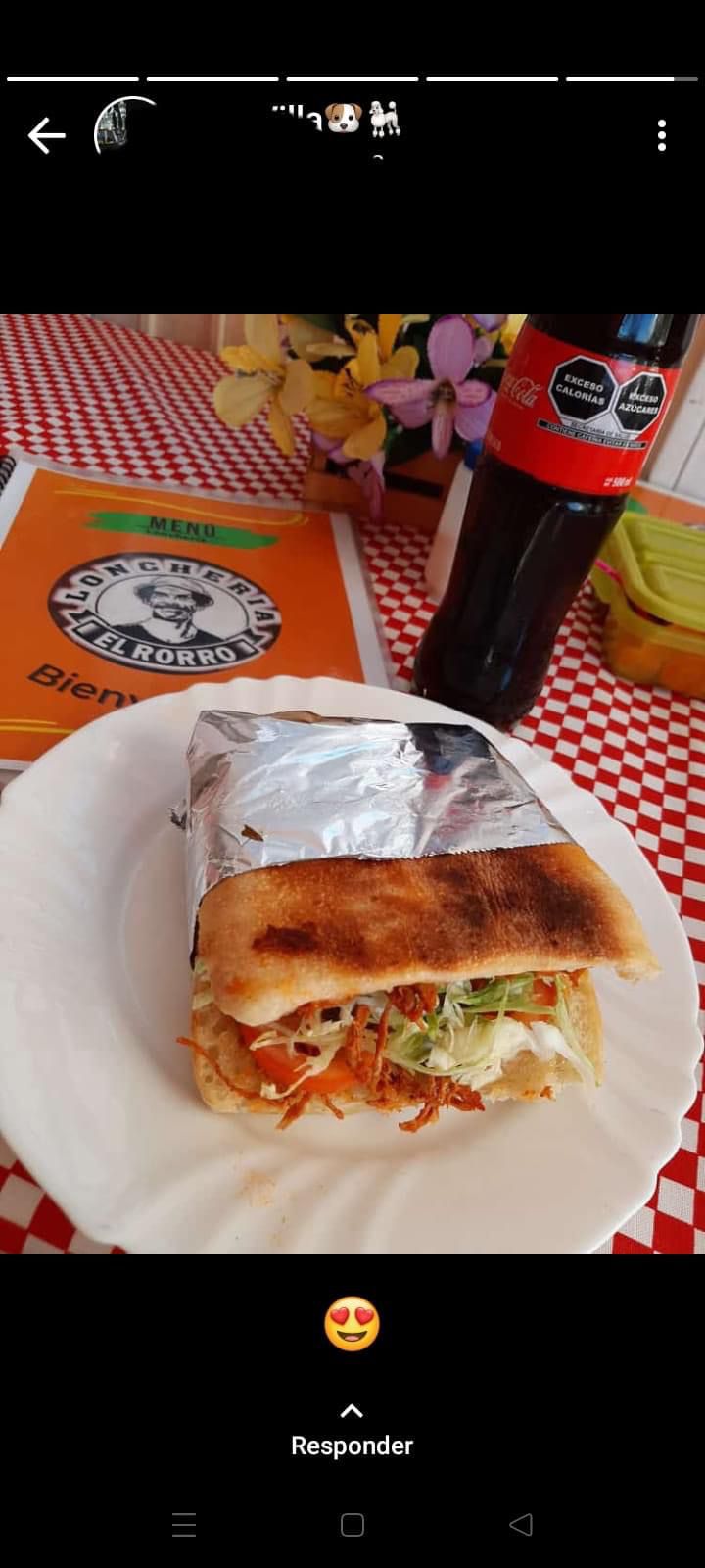 Telera mediana acompañada de lomo adobado, mayonesa, lechuga, jitomate, cebolla y chile jalapeño.