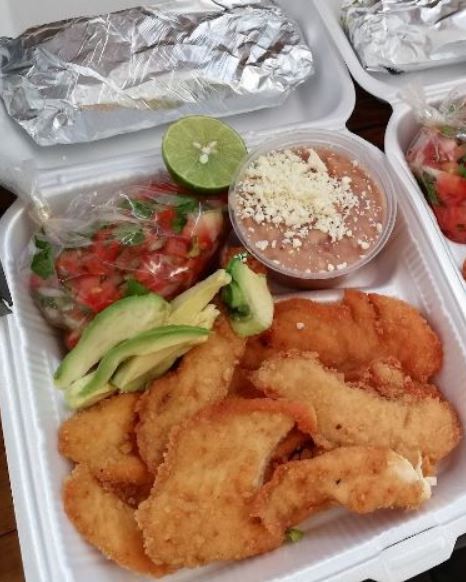 Milanesa empanizada acompañada de una porción de frijoles refritos, ensalada de lechuga, jitomate, cebolla, 5 tortillas de maíz y salsa.