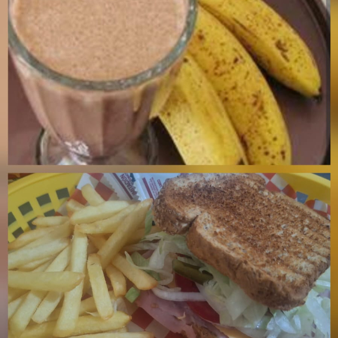 SANDWICH JAMON CON QUESO AMARILLLO Y PAPAS*1 + Licuado de Chocomilk con Plátano*1