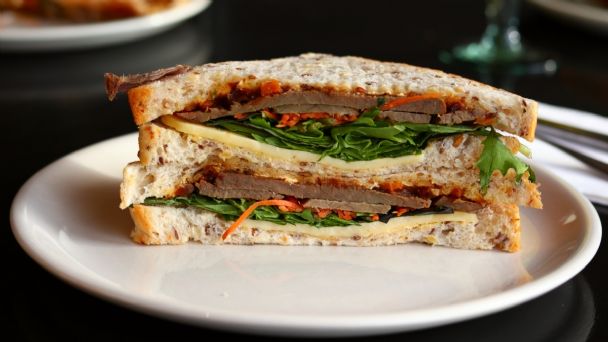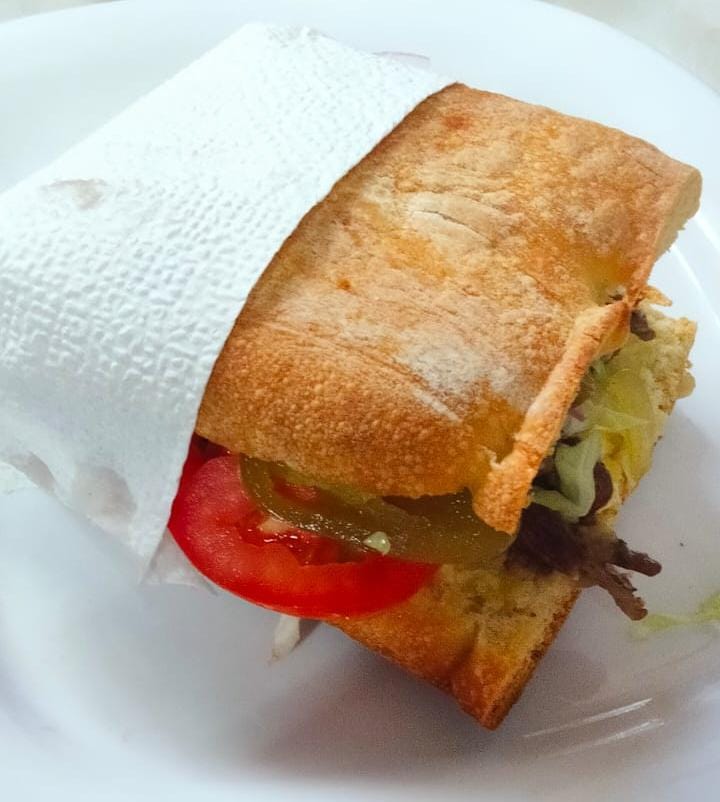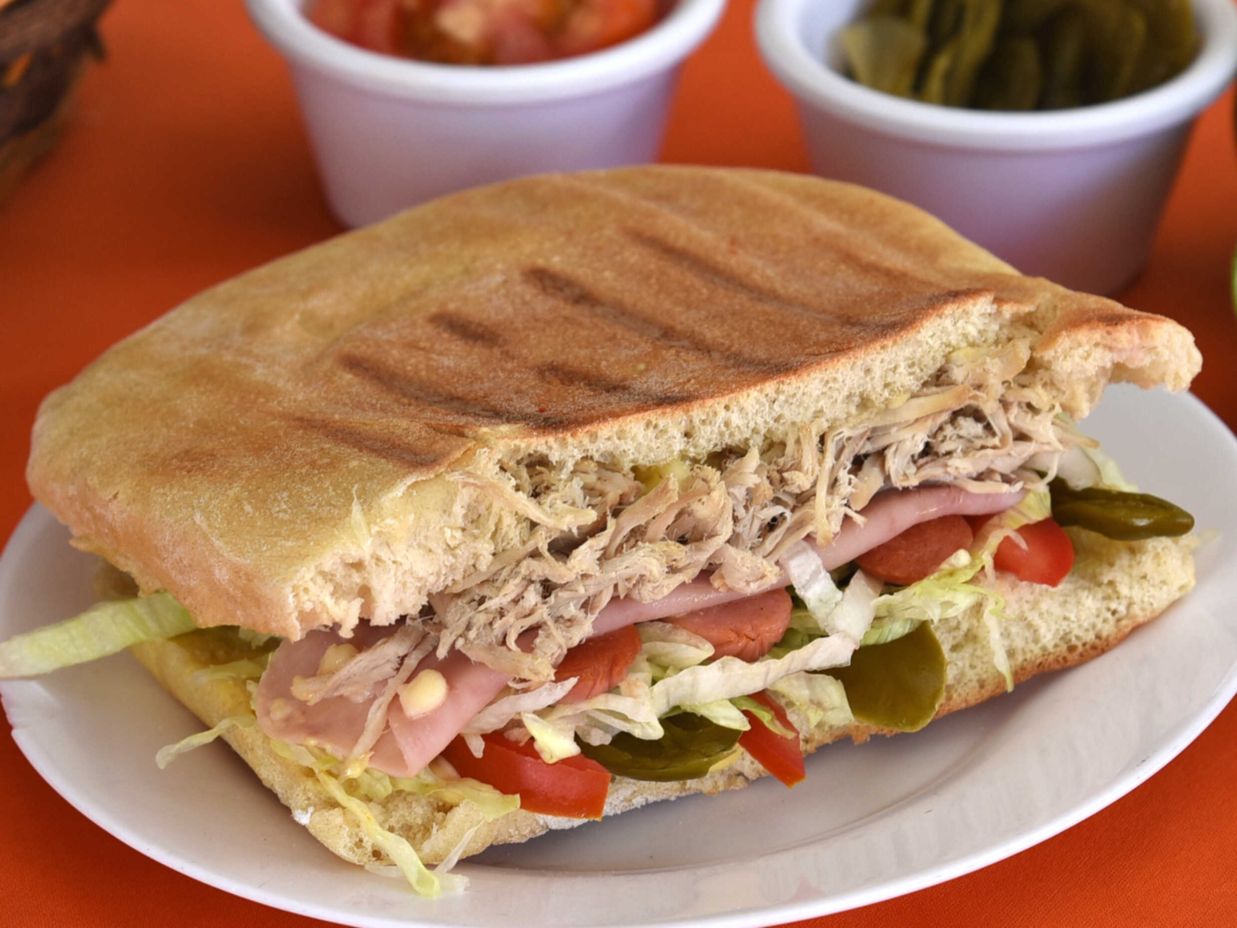 Pierna deshebrada, salchicha de pavo, jamón de pavo y queso asadero derretido.