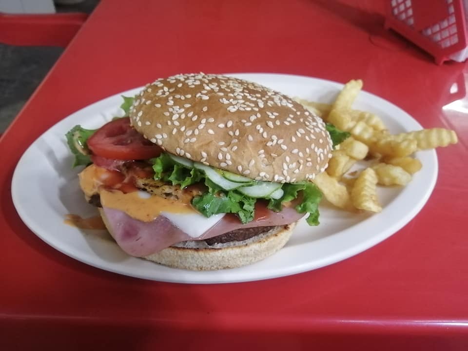 Hamburguesa con carne de res de 85gr, queso manchego, lechuga, jitomate, cebolla, jalapeño.