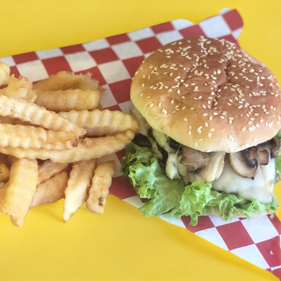 Hamburguesa de 150gr con champiñón, queso manchego, lechuga, jitomate, cebolla, jalapeño.