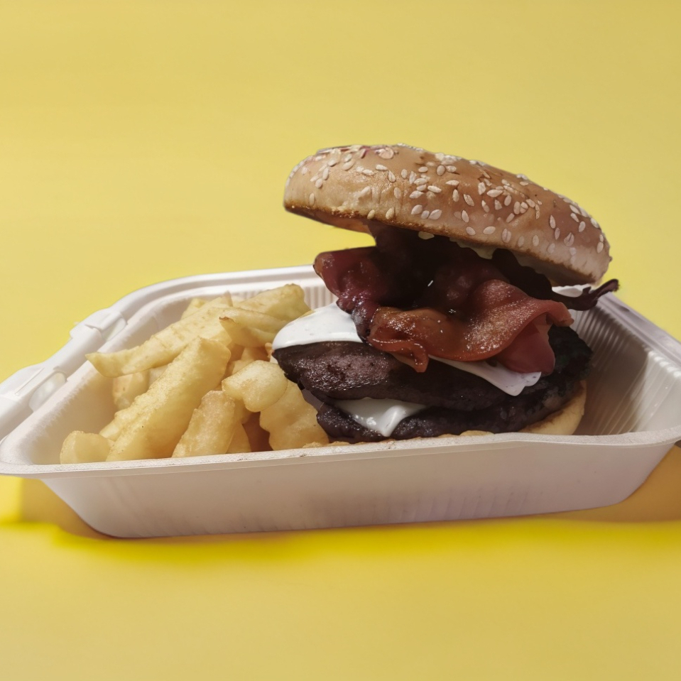 Hamburguesa de 300gr con doble carne de res, queso manchego, lechuga, jitomate, cebolla, jalapeño.
