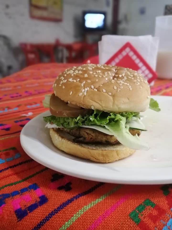 Hamburguesa con pollo, queso manchego, lechuga, jitomate, cebolla, jalapeño y pepino.