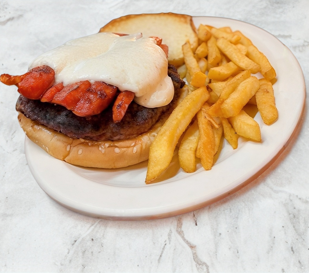 Hamburguesa de 265gr, con carne de arrachera, chorizo asado, queso.