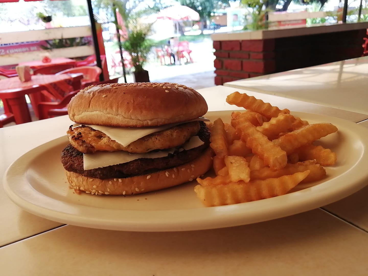Hamburguesa doble, combina arrachera y camarón, queso manchego, lechuga, jitomate.