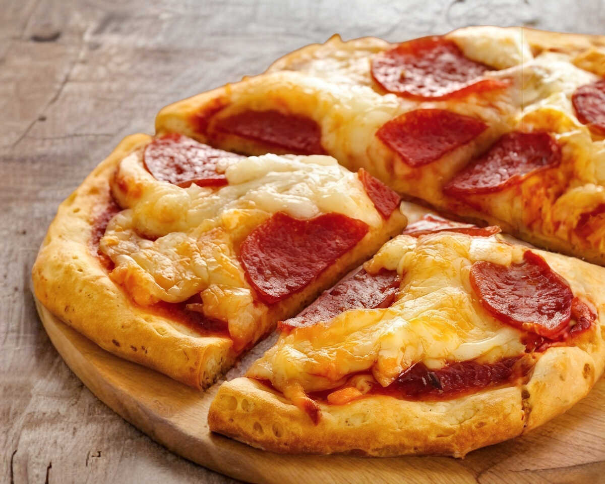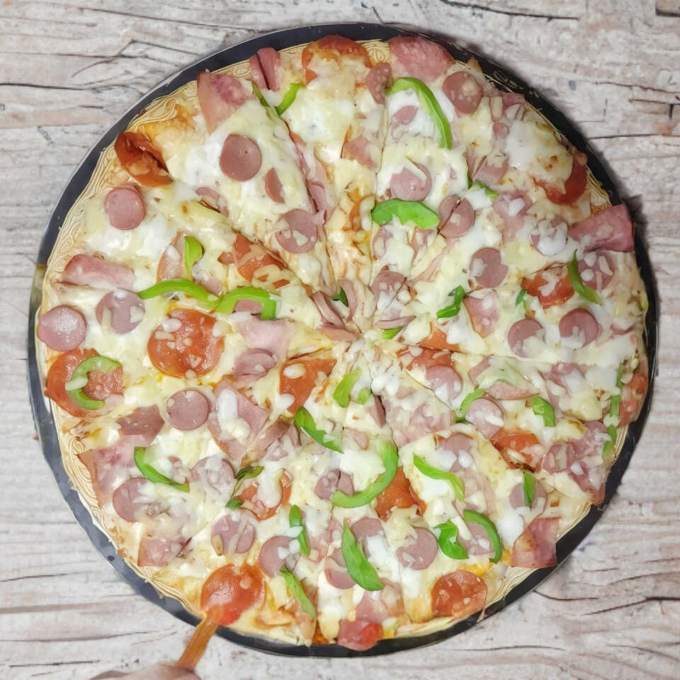 Masa artesanal del día con extra queso, pepperoni, salami, salchicha, jamón y pimiento verde, tamaño a elegir. Incluye habanero y Chimichurri.