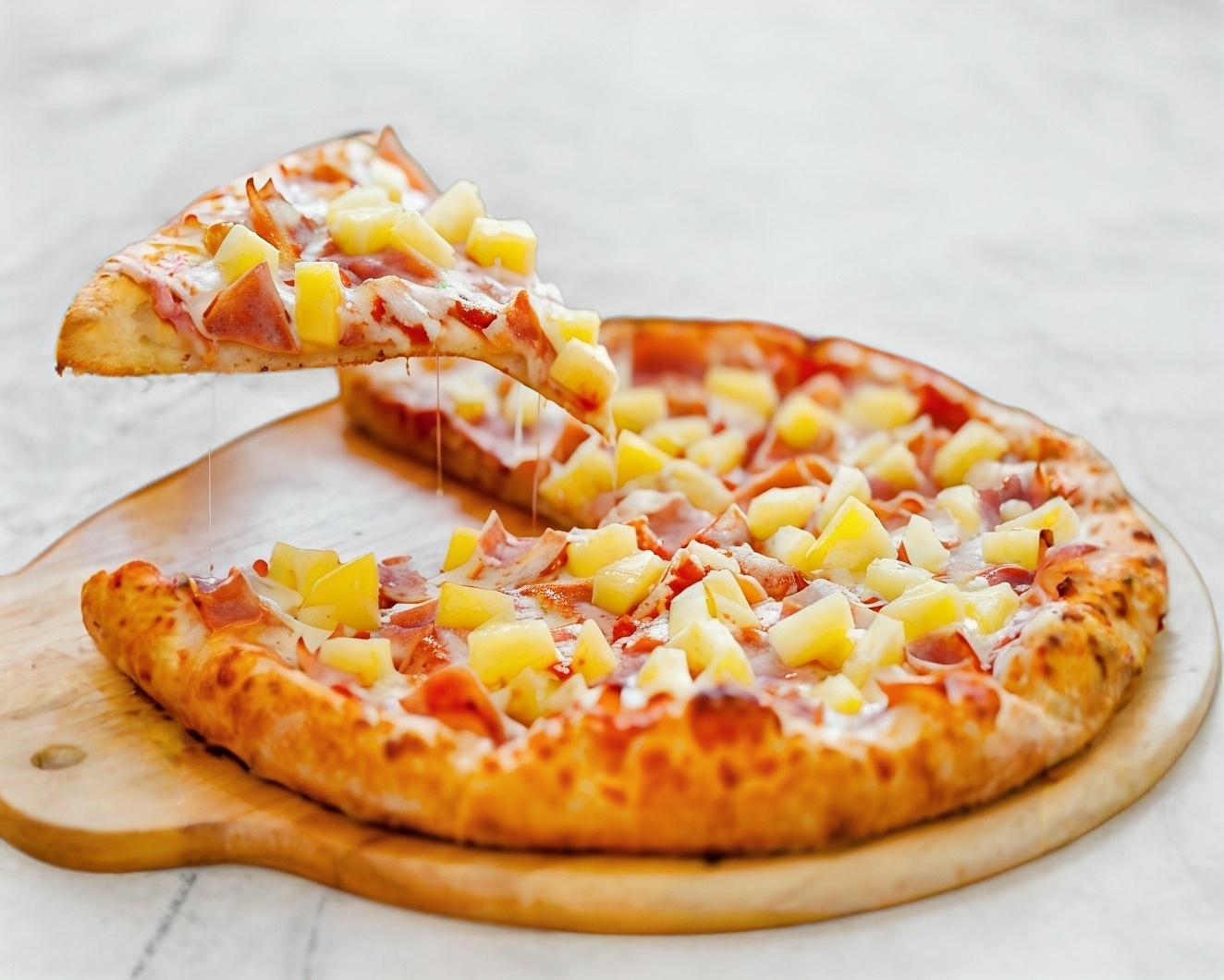 Masa artesanal del día, jamón, piña, extra queso, tamaño a elegir. Incluye habanero y Chimichurri.