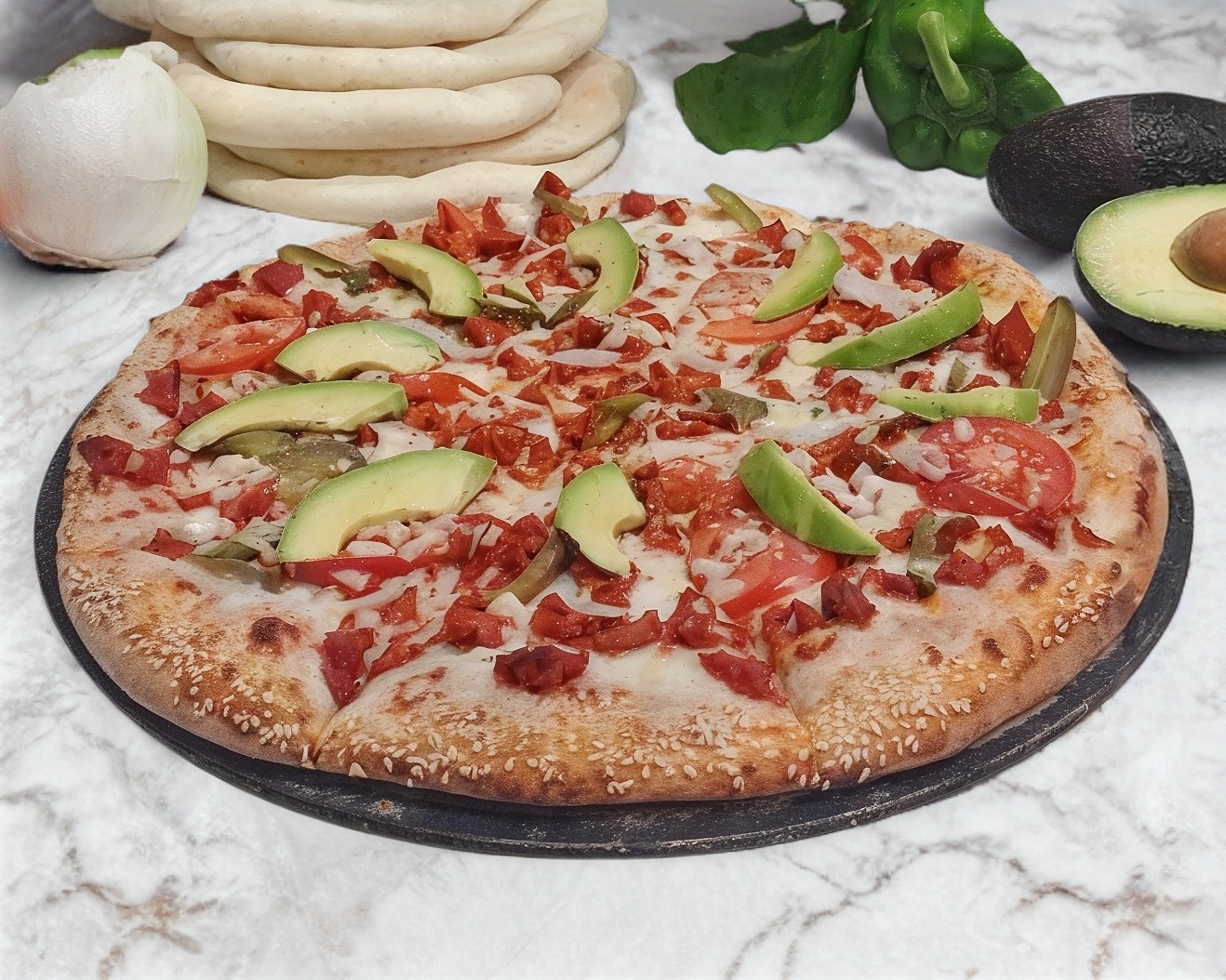 Masa artesanal del día con extra queso, chorizo, jitomate, cebolla, jalapeño, aguacate, tamaño a elegir. Incluye Habanero y Chimichurri.