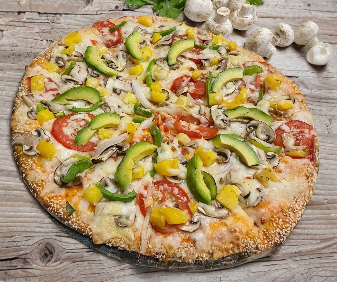 Masa artesanal del día con extra queso, champiñón, piña, pimiento verde, cebolla, jitomate y aguacate, tamaño a elegir. Incluye habanero y Chimichurri.