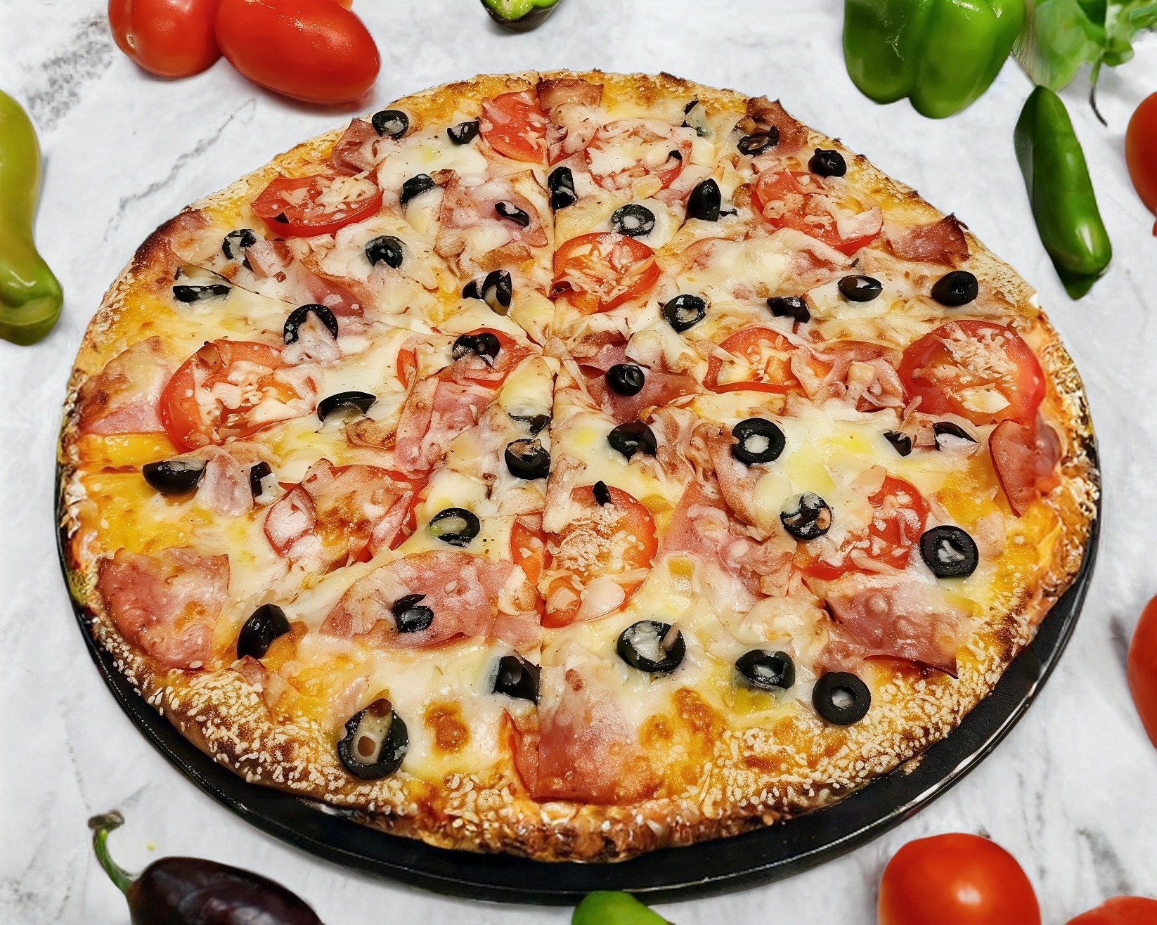 Masa artesanal del día con extra queso, tocino, salami, jitomate y aceituna negra, tamaño a elegir. Incluye habanero y Chimichurri.